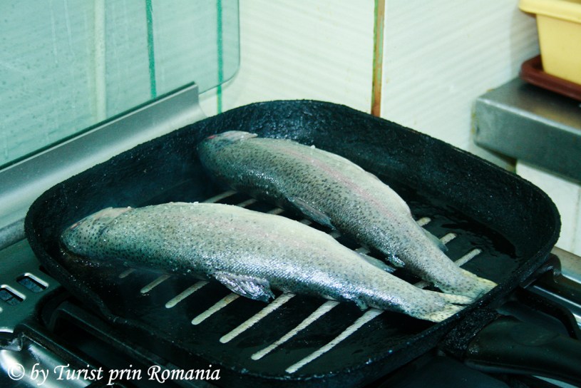 Păstrăvul proaspăt a fost bine curățat și asezonat cu trunchi de pătrunjel și două felii de lămâie, apoi a fost pus pe grătar pentru a se rumeni bine.