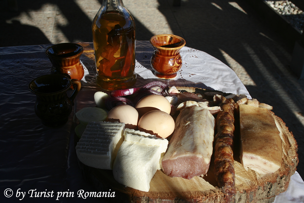 Imediat cum am ajuns au apărut pe masă mușchiulețul afumat, cârnații, brânza de la oile proprii, pâinea de casă și o țuică galbenă cu jug în sticlă.