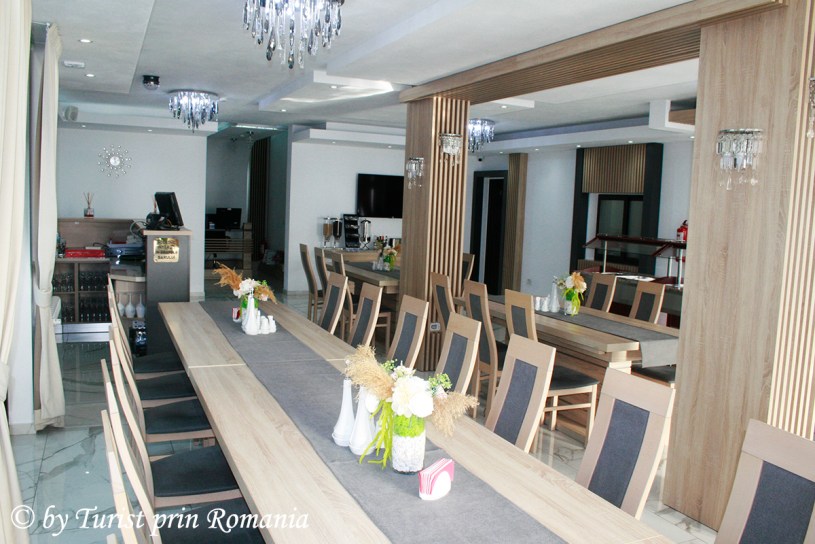 O sală imensă cu mesele frumos dispuse în așa fel încât fiecare masă să aibă parte de spațiul necesar de intimitate, o paletă de culori care induce relaxarea și liniștea și ferestre mari ce poartă privirile către vârfurile montane și pajiștile înverzite în compania delicioaselor mâncăruri tradiționale maramureșene.