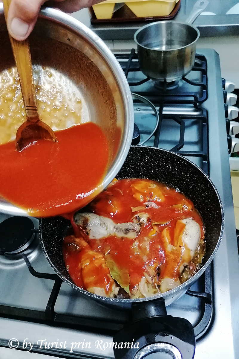 După ce pulpele de pui s-au sigilat bine și au început să prindă culoare, a pus ceapa, boabele de piper și foaia de dafin. A amestecat puțin tot acest produs rezultat, a lăsat puțin la călit apoi a pus puțină apă și a lăsat câteva minute la fiert, apoi a turnat sosul gros de roșii, secretul bucătarului. A dat focul mic și a început să prepare mămăliga.