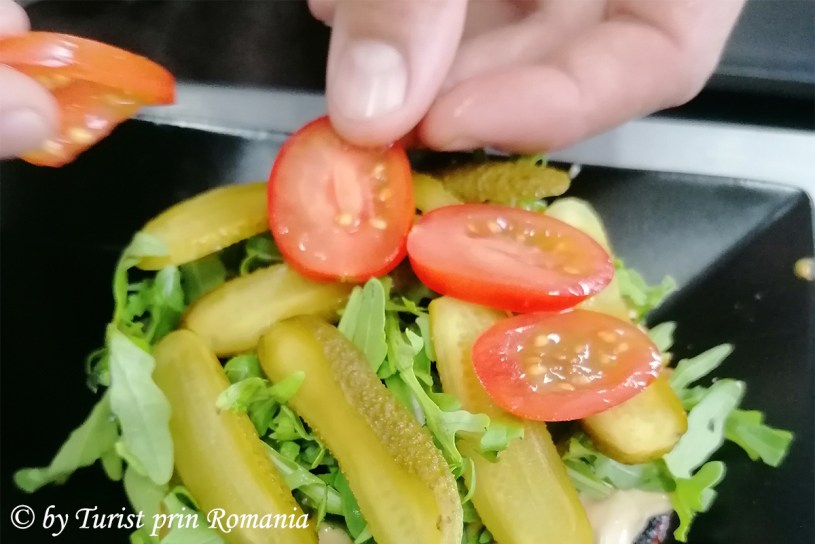 Pe un pat de rucola, chef Budai a așezat cu grijă prima parte de chiflă prăjită, apoi a adăugat sosul de burger, rucola, roșii și castraveți murați, chifteaua de carne, sosul de brânză, feliile de bacon puțin trase în ulei, apoi a adăugat cealaltă jumătate de chiflă.