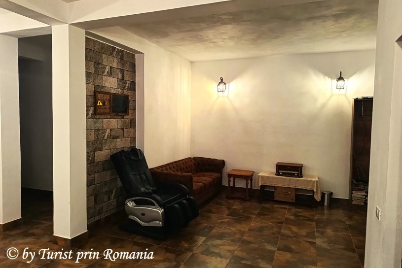 La interior, un living/salon de servire a mesei te întâmpină cu un spațiu generos dotat cu o canapea, un scaun pentru masaj și mese suficiente cât să acomodeze persoanele cazate aici.