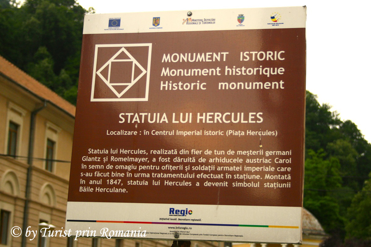 În zona Centrului Istoric, situată în nordul staţiunii Băilor Herculane, este amplasată statuia lui Hercules, fiul lui Zeus şi al unei muritoare, regina Alcmene. Hercules este înfățișat purtând o piele de leu pe spate (leul din Nemeea) şi măciuca folosită în lupte pe umărul stâng. Capturarea leului din Nemeea a fost prima muncă a lui Hercules din cele douăsprezece munci, stabilite de regele Euristeu. Postura sa este impunătoare inspirând forță, siguranță de sine și echilibru.