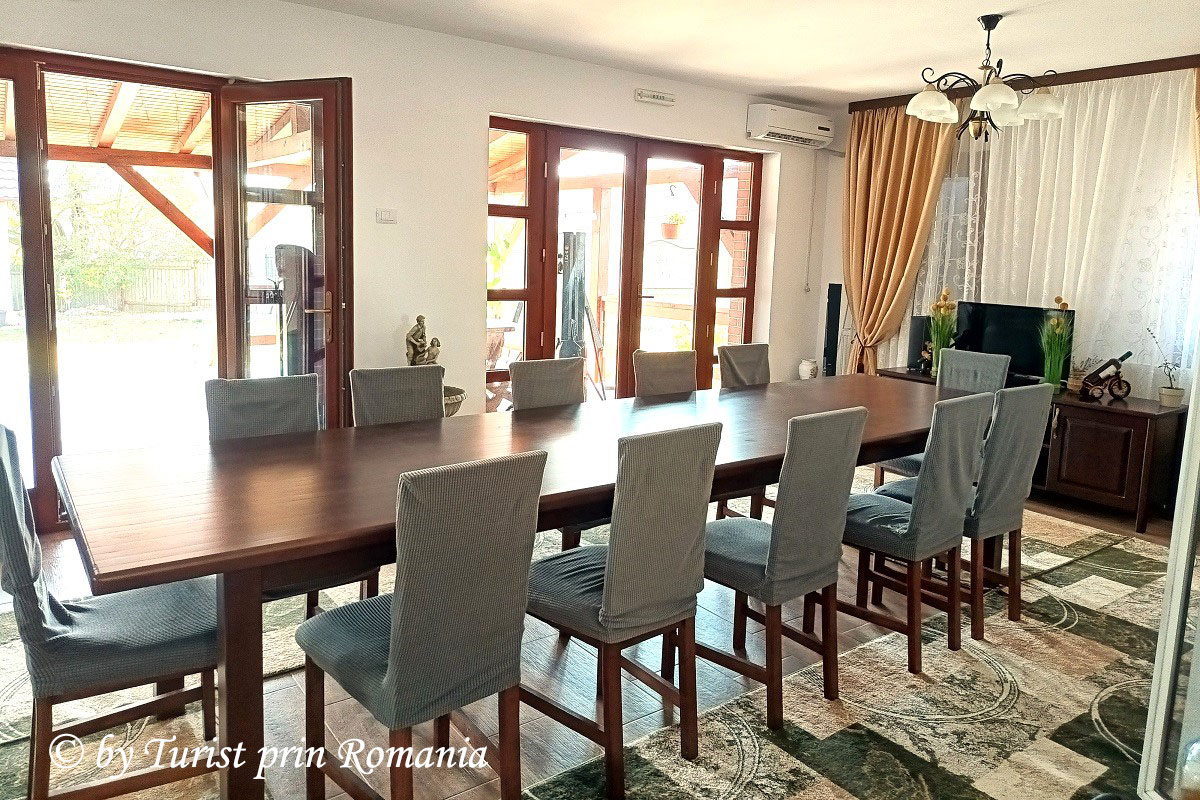 Ca o continuare firească a livingului, sala de mese este, de asemenea, un spațiu generos dotat cu frigider și mobilier modern necesar musafirilor pensiunii.