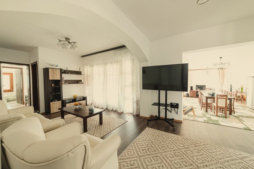 În pensiune, un spațiu generos este alocat socializării și, bineînțeles, degustării vinurilor pe care familia le produce. Canapele confortabile, mobilier modern și multă lumină sunt doar câteva din elementele centrale ale livingului generos.