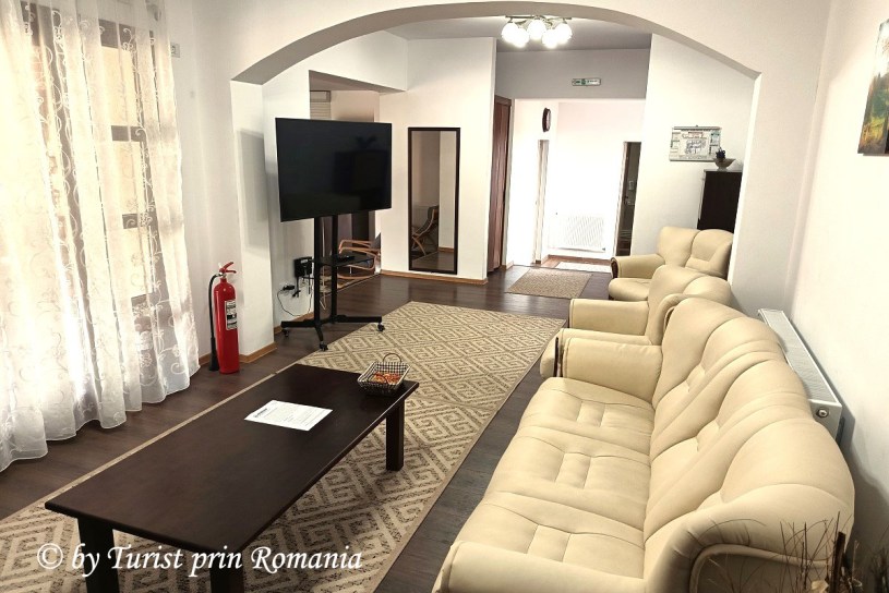 Ca o continuare firească a livingului, sala de mese este, de asemenea, un spațiu generos dotat cu frigider și mobilier modern necesar musafirilor pensiunii.