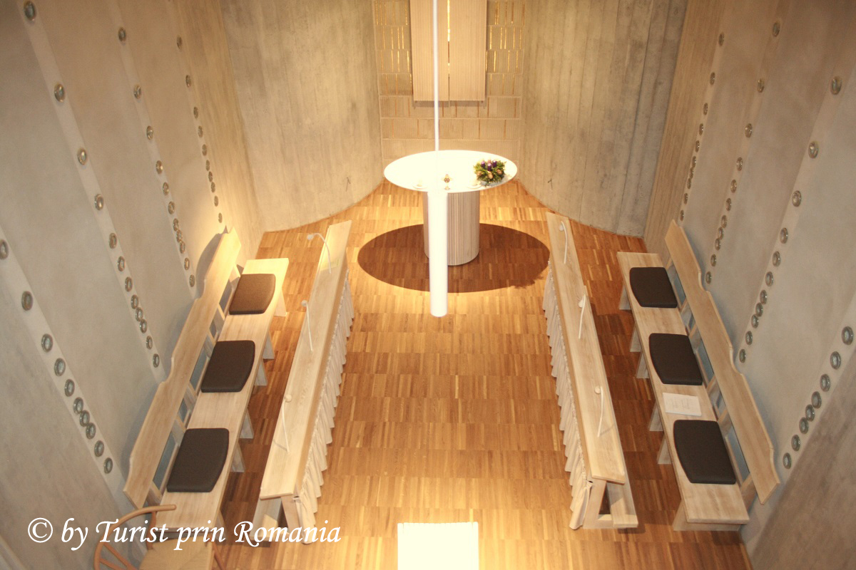 Mănăstirea este structurată pe trei etaje, fără scări, accesul de la un etaj la altul făcându-se pe o platformă lină, în rampă, în spirală. Acest lucru a fost gândit de așa natură încât să faciliteze și accesul celor cu dizabilități motorii. La etajul 1 există o cameră de rugăciune unde se pot ruga doar călugării. Cei care doresc să se roage alături de ei o pot face de la etajul 2, prin intermediul a două uși situate deasupra camerei, uși ce oferă acces din exterior către lăcașul de rugăciune și închinăciune. Și aici simplitatea este cuvântul de ordine.