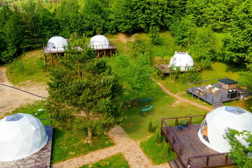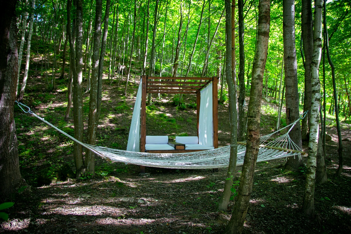 Hamace atârnate între copaci, mese din fier forjat cu scaune, locuri de belvedere sau poteci pietruite frumos amenajate se regăsesc pe toată suprafața locației, iar dispunerea lor este făcută în așa fel încât să păstreze intimitatea celor care le folosesc.